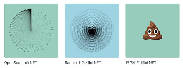 因此,作为一个实验,我制作了一个会根据查看者而变化的 NFT,因为提供图像的 Web 服务器可以根据请求者的 IP 或用户代理选择提供不同的图像。例如,它在 OpenSea 上看起来是这样的,在 Rarible 上看起来是另一种样子,但当你从加密钱包购买并查看它时,它总是会显示为一个大 ? 表情符号。你出价的不是你得到的。这个 NFT 没有什么不寻常的,而是 NFT 规范的构建方式。许多价格最高的 NFT 随时可能变成 ? 表情符号;我只是明确表示了这一点。