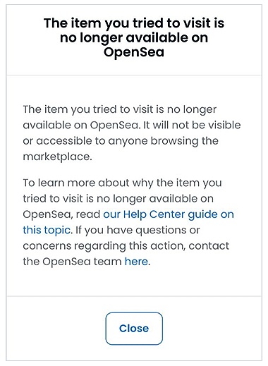 几天后,没有任何警告或解释,我制作的 NFT 就从 OpenSea(一个 NFT 市场)中被删除了: